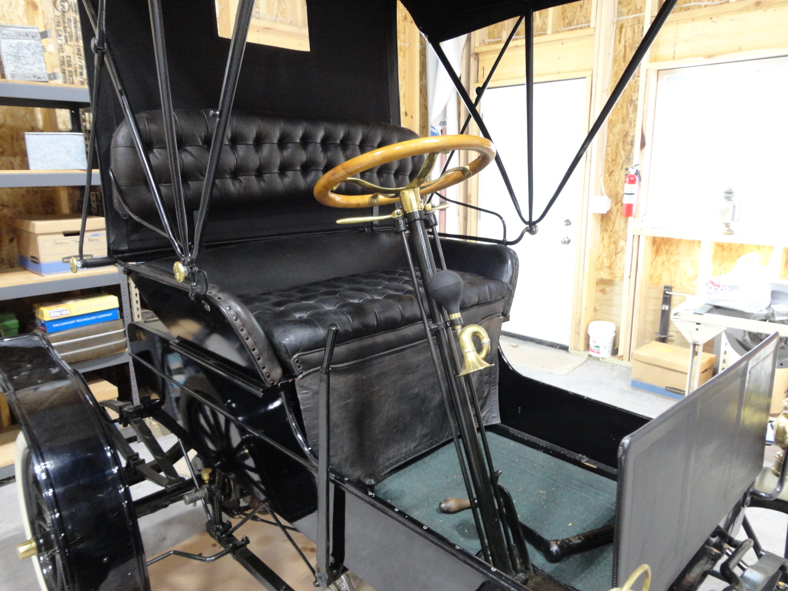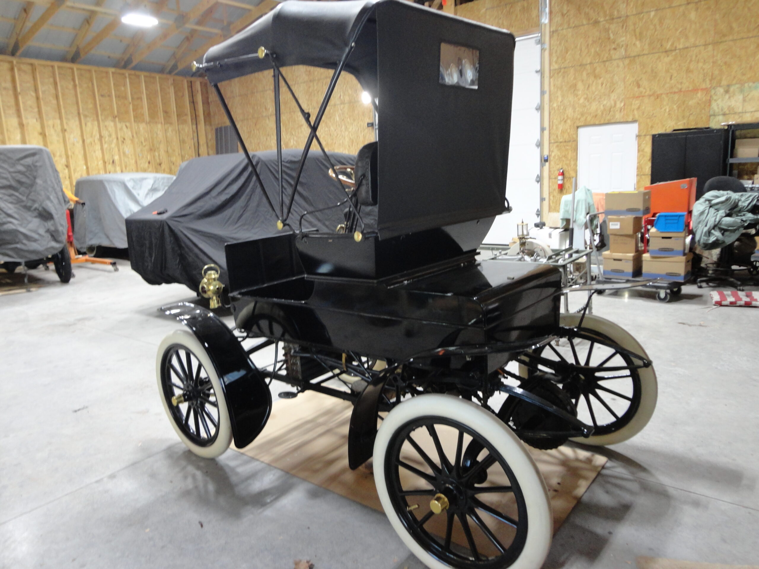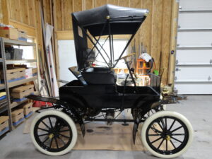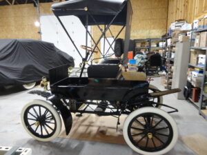 1907 Jewel Model D in As New restored condition. No expenses spared in this nut & bolt, ground up restoration. Jewel buckboard style early automobiles are extremely rare and very few exist today. So rare in fact that none are listed in the HCCA directory. These cars were produced by the Forest City Motor Car Company in Massillon, Ohio from 1906 to 1909 when production ceased due to a merger with Keeton Town Car Works. Jewels were powered by a two cycle type engine making 8 full horse power. Transmission was an improved planetary type with two speeds forward and reverse. Speed in 1906 was 4 to 15 mph. In 1907 speed was improved to 30mph with jackshaft being eliminated and single chain drive adopted from engine directly to the rear axle. Pneumatic tires in size 28×3 became standard in 1907 with tops being optional. If you want to own a really, really rare example of an early car–Look no further. There is also a 1906 Jewell model B project available. Call for details and more pics.