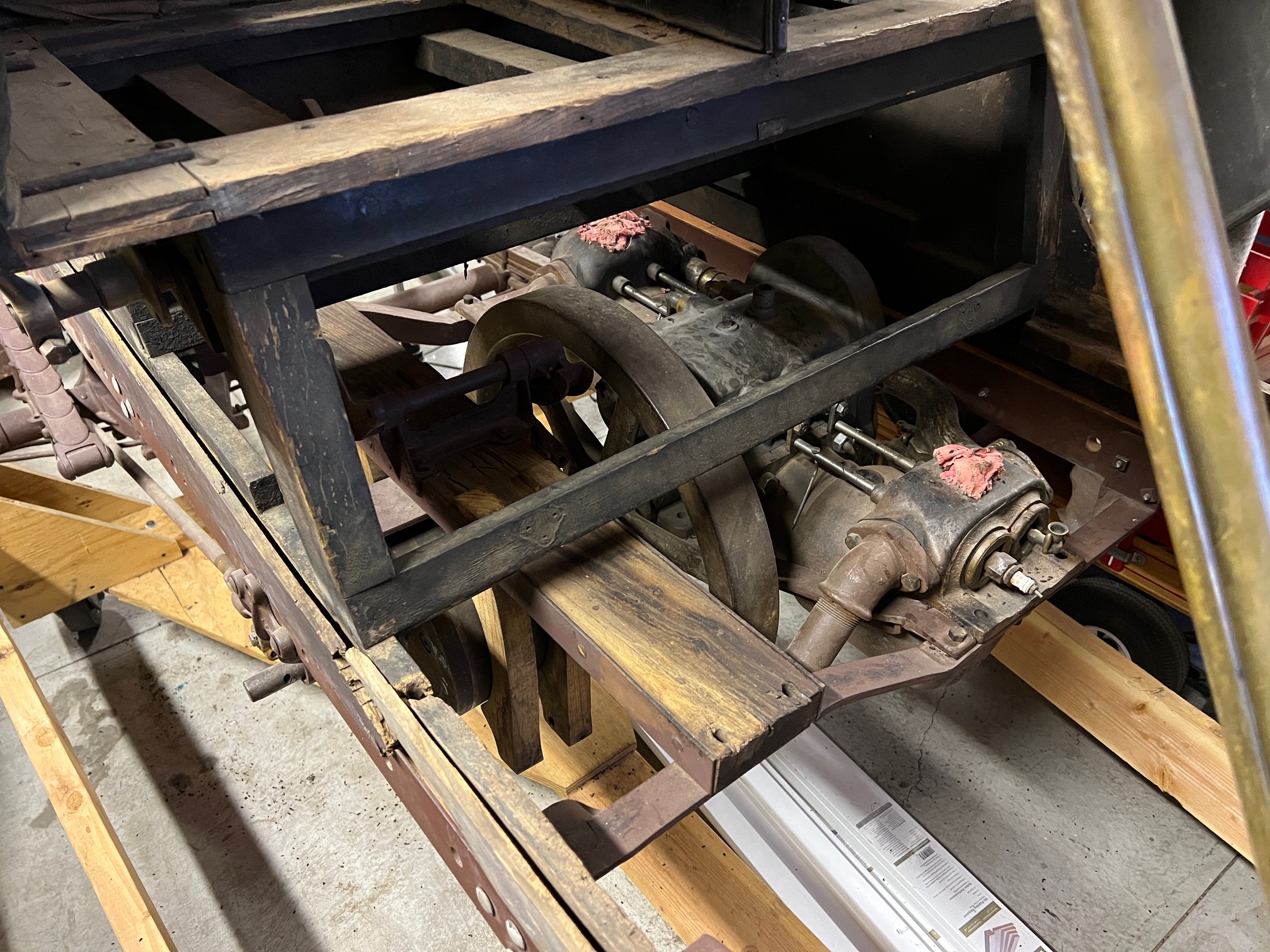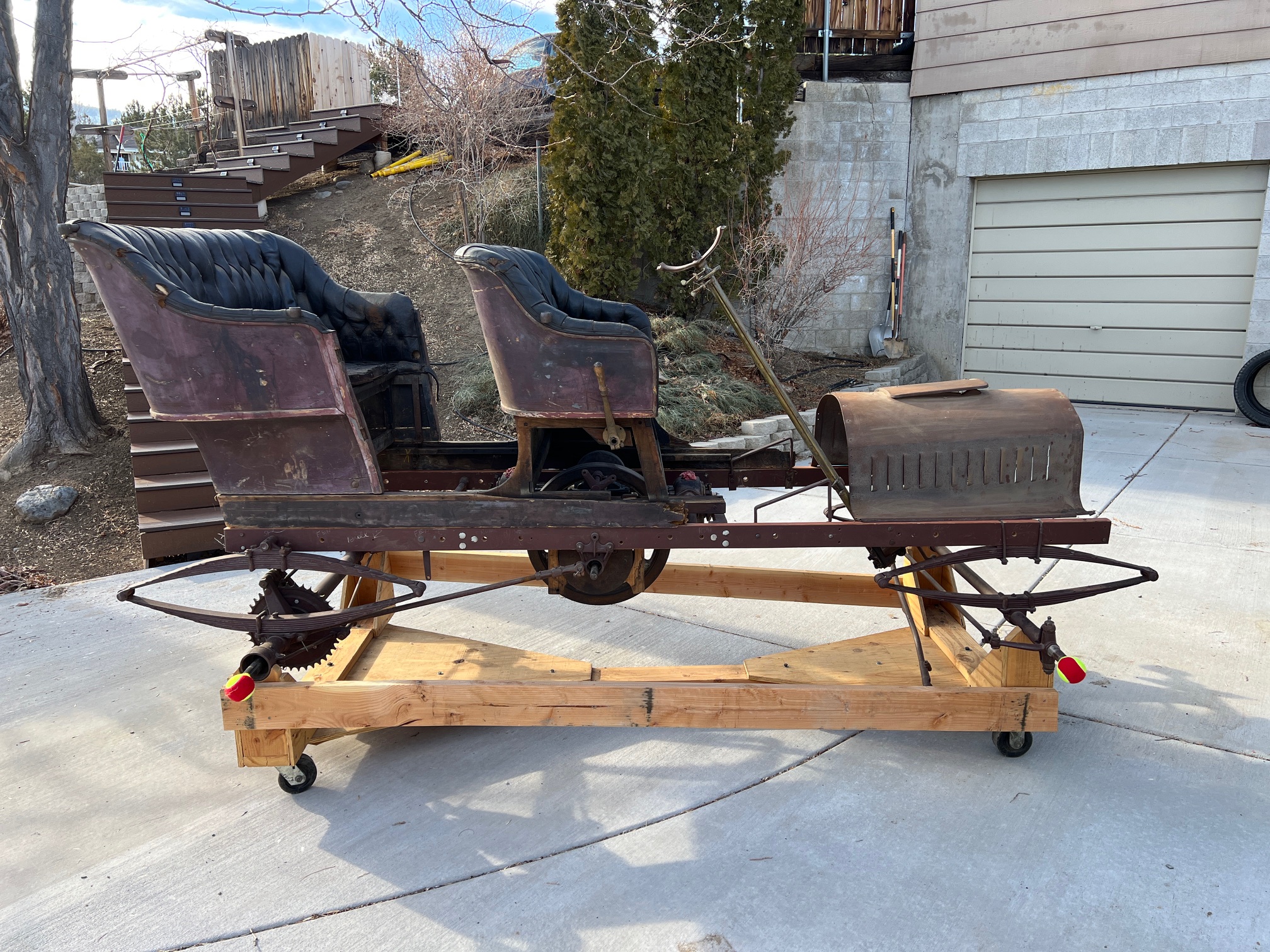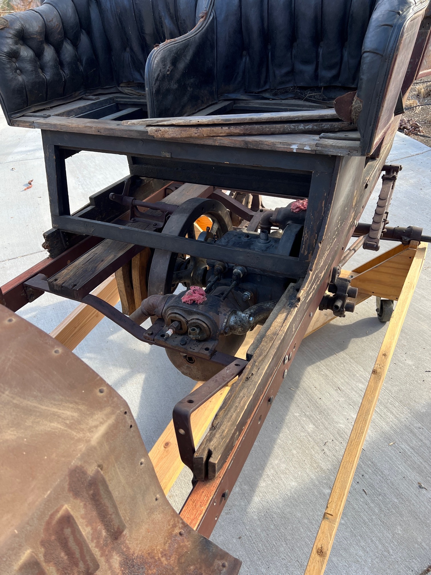 This 1907 Tourist Model K Touring was purchased 28 years ago out of Chico California while in boxes. To make storage easier I partially assembled it on a rolling platform to make moving it around the garage easier. This also came in handy when it was moved so that it could be on temporary display at the Nation Automobile Museum in Reno Nevada. The original body and upholstery show all the color and detail used on the Tourist Model K in 1907. This body still shows the maroon body color with pinstriping, while the interior shows the material and design. There are a limited number of these wonderful automobiles known to survive. This is a rare opportunity to own and restore a rare California marquee. This car comes with a collection of photos, pamphlets, and club magazine articles.