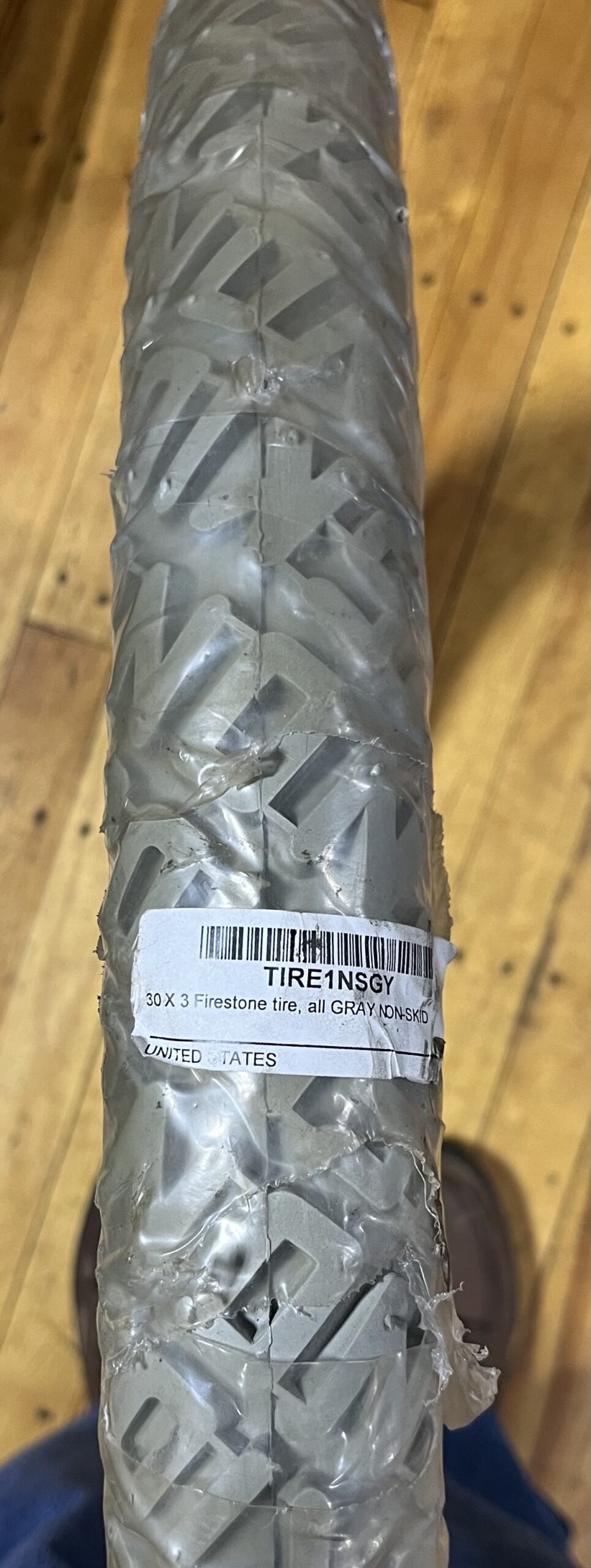 New Old Stock all GREY Tires (1) 30 x 3 “Non-Skid Firestone Tire Originally $320.00, now $150.00 (1) 30 x 3-1/2” “Universal Straight Rib” Originally...